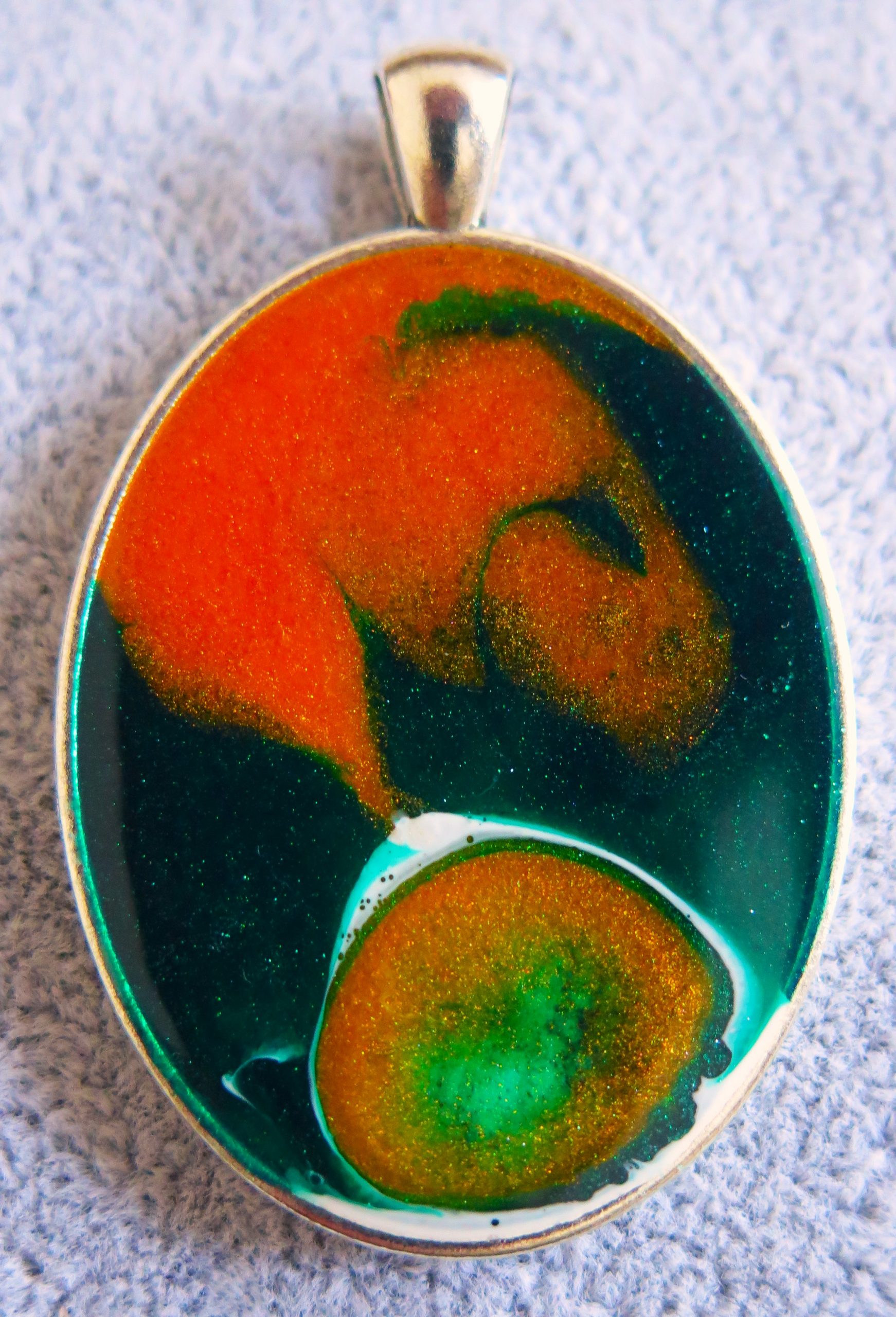 Halskettenanhänger aus Epoxidharz – Orange, Schwarz und Grün (40×30 mm)