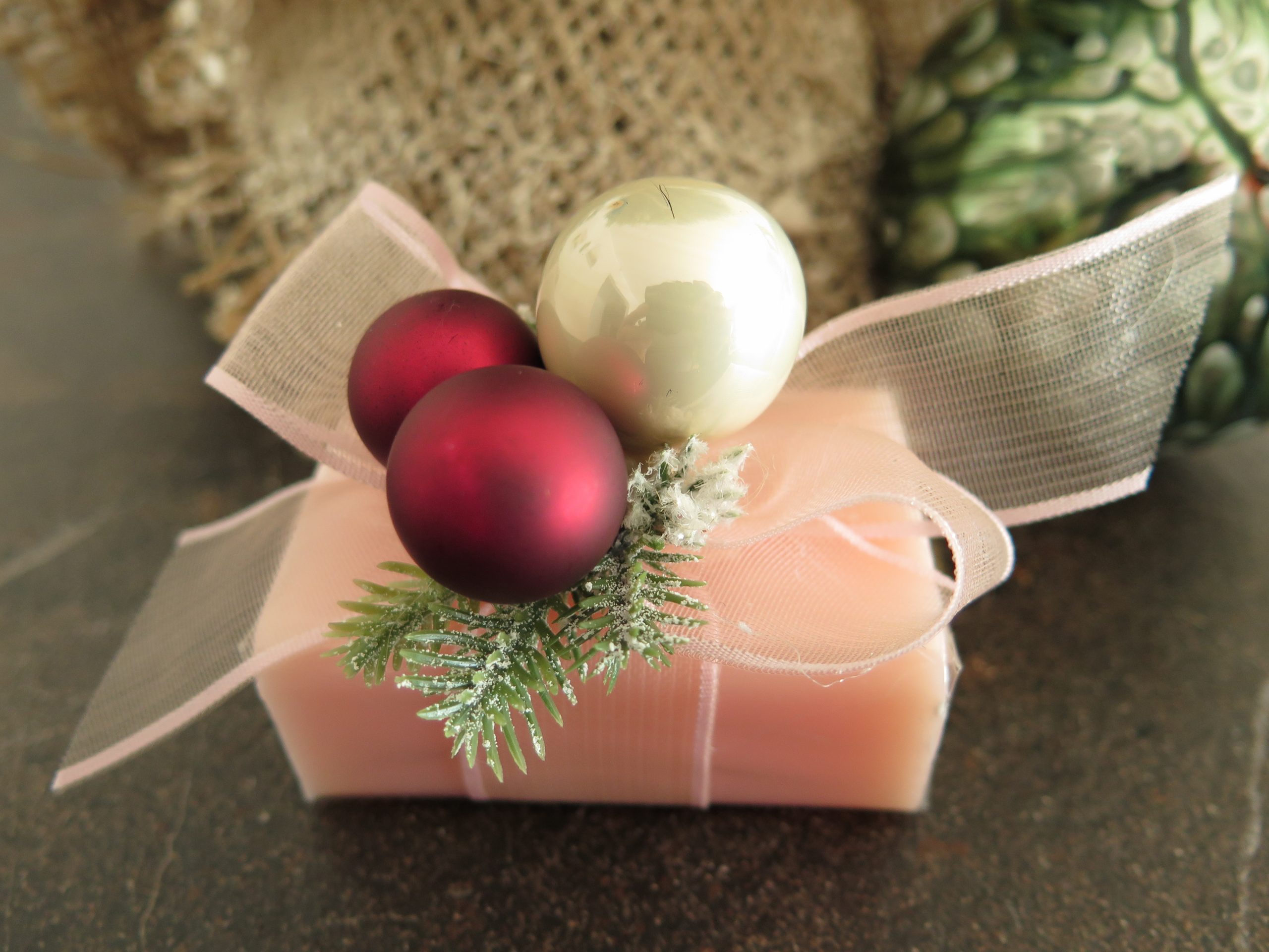 Die weihnachtlich dekorierte Blockseife „Pfingstrose“ ist das ideale Geschenk – ob als Einzelpräsent oder als kleine Aufmerksamkeit für betriebliche Weihnachtsfeiern.